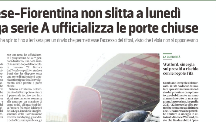 Porte chiuse. La parola finale è arrivata ieri in tarda serata dalla Lega serie A al termine di una giornata tambureggiante, durante la quale aveva preso piede l'ipotesi di uno slittamento della gara a lunedì, una decisione che avrebbe permesso di aprire le porte dello stadio Friuli, visto che l'ordinanza regionale emessa sull'emergenza coronavirus terminerà domenica sera e che il successivo decreto del Governo permetteva lo svolgimento delle partite del week-end nelle regioni interessate esclusivamente senza pubblico.Proprio per aggirare questi paletti la società Udinese ha spinto fino in tarda serata per un rinvio, facendosi forte anche dalla posizione della Fiorentina che si opponeva all'ipotesi di una "gara differita" a porta aperte. Ma l'alleato principale per un simile piano era principalmente il derby d'Italia, la partita Juventus-Inter per la quale (come riferiamo dettagliatamente in questa stessa pagina) si è lavorato a lungo per permettere ai tifosi di entrare allo Stadium facendo leva sulla durata dell'ordinanza piemontese che, effettivamente termina sabato sera, ma non può sovrastare il decreto governativo che parla in modo chiaro di partite a porte chiuse fino a domenica sera.Perso questo appiglio, anche l'ipotesi di uno slittamento della sola gara del Friuli ha perso quota, tanto che poco prima delle 22 la Lega serie A, con una nota, ha ufficializzato il programma della 7ª giornata di ritorno, una nota arricchita subito dopo dalla circolare numero 22 firmata dall'head competition Andrea Butti che ha disposto tutta una serie di indicazioni organizzative riguardo allo svolgimento delle partite a porte chiuse.Sabato all'interno dell'impianto dei Rizzi potrà entrare il personale tecnico con funzioni strettamente connesse alla gara per un massimo di cento unità, gli incaricati della Procura federale, i delegati della Lega, i medici e i rappresentanti della Commissione federale antidoping, gli addetti della Sicurezza pubblica, gli operatori televisivi, un fotografo ufficiale e un social media manager per ciascuna società e gli operatori dell'informazione nel numero massimo di 15o persone.