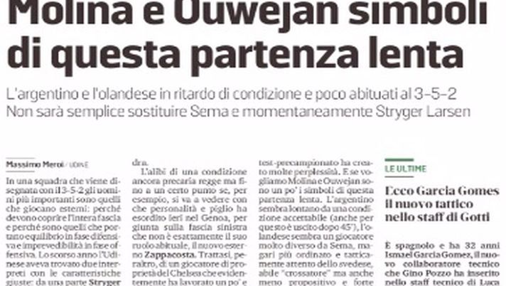 "A vedere l'Udinese all'opera in questo precampionato la prima cosa che è balzata all'occhio, oltre alla difficoltà di segnare, è la difficoltà a sfondare sulle fasce: contro la Spal Molina e Ouwejan sono sembrati inevitabilmente in ritardo proprio come l'intera squadra. Quello che si è visto nei test-precampionato ha creato molte perplessità. E se vogliamo Molina e Ouwejan sono un po' i simboli di questa partenza lenta. L'argentino sembra lontano da una condizione accettabile, l'olandese sembra un giocatore molto diverso da Sema, magari più ordinato e tatticamente attento dello svedese, abile "crossatore" ma anche meno propositivo e forte nell'uno contro uno. Insomma, sembra più uno da difesa a quattro che esterno a tutta fascia e le alternative bisogna al momento archiviarle quasi alla voce non pervenuto. Ter Avest si è visto nel secondo tempo con il Venezia, Zeegelaar venti minuti sabato. Davvero poco. Servirà avere un po' di pazienza, il problema è che il campionato parte tra sei giorni e i punti in palio saranno subito pesanti visto che l'Udinese dovrà affrontare in quattro giorni quelle che sulla carta sembrano due avversarie dirette (Verona e Spezia)".