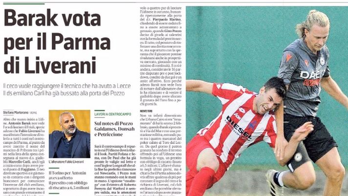 "Altro che nuovo inizio a Udine. Antonin Barak non vede l'ora di lasciare il Friuli, specie adesso che Fabio Liverani ha manifestato l'intenzione di volerlo a tutti i costi nel centrocampo del Parma. Il neo direttore sportivo gialloblù Marcello Carli si è già messo in contatto con i dirigenti bianconeri per comunicare l'interesse del club emiliano, soprattutto dopo avere incassato con grande entusiasmo il gradimento del biondo centrocampista, diventato papà del piccolo Antonin junior l'11 agosto. Barak ha fatto il diavolo a quattro pur di lasciare l'Udinese in autunno, bussando ripetutamente alla porta del d.t. Pierpaolo Marino, chiedendo di essere ceduto fino a essere accontentato a gennaio, quando Gino Pozzo decise di girarlo ai salentini con la formula del prestito secco, con la speranza che il giocatore potesse rivalutarsi anche in prospettiva mercato, giocando con un minimo di continuità. E così è andata, considerate le 16 partite disputate pre e post lockdown, condite da due gol e un assist all'attivo. Ecco perché adesso Barak non vede l'ora di tornare dall'allenatore che lo ha rilanciato e di vestire il gialloblù dopo avere sfiorato il granata del Toro fino a pochi giorni fa".