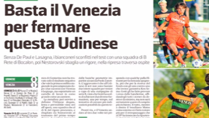 "La sconfitta con il Venezia vale la prima sconfitta stagionale in precampionato dopo i due successi con Vicenza e Legnago, ma soprattutto un cartello di lavori in corso grande come un cantiere. La metafora può servire a definire l'Udinese slegata, lenta e prevedibile vista ieri all'opera, una squadra che non ha saputo rendersi mai pericolosa, né tanto meno ha saputo imporre la sua superiore caratura a cospetto di un Venezia senza dubbio più brillante, quanto a gamba, ma anche più ordinato e corto tra i reparti. L'aggravante è che all'Udinese di ieri non sono bastate due intere squadre per venire a capo di una compagine di serie B, visto che Gotti ha scelto di schierare due diverse formazioni, una per tempo. L'Udinese della ripresa ha vissuto all'inizio su due fiammate di Mallè, esterno a sinistra, e sulla ricerca di una regia defilata da parte di Barak, provato interno destro, mentre Forestieri ha fatto la mezzala sinistra di inserimento, alla ricerca di accelerazioni e un paio di duetti non riusciti con un Okaka lontano dalla migliore condizione. Troppo poco almeno per pareggiare il conto, anzi nel finale il Venezia ha colpito la traversa con Capello a Nicolas battuto".