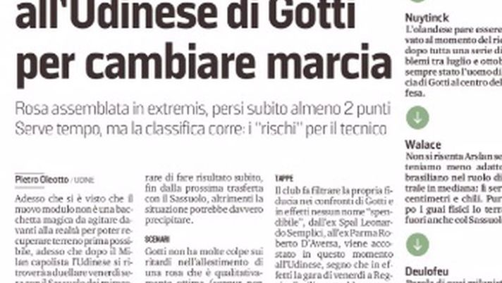 "Smontando la difesa "a 3" e di conseguenza il collaudato 3-5-2 che (con l'arrivo di molti esterni, sia difensivi, sia d'attacco) è diventato forse poco adatto alle caratteristiche della rosa bianconera nel suo complesso, bisogna ricreare degli automatismi che richiedono tempo per essere metabolizzati. Ma l'Udinese deve sperare di fare risultato subito, fin dalla prossima trasferta con il Sassuolo, altrimenti la situazione potrebbe davvero precipitare. Gotti non ha molte colpe sui ritardi nell'allestimento di una rosa che è qualitativamente ottima, ma è stata completata soltanto il 5 ottobre, dopo tre giornate di campionato e tre partite (Verona, Spezia e Roma) che avrebbero dovuto portare almeno dai 2 ai 4 punti. Il club fa filtrare la propria fiducia nei confronti di Gotti e in effetti nessun nome "spendibile" viene accostato in questo momento all'Udinese. Per questo il tecnico adesso spera più che altro di recuperare qualche elemento che potrebbe dare più solidità al complesso bianconero come Nuytinck. L'allenatore bianconero potrebbe voler ritornare alle sicurezze del 3-5-2, considerando che per il 4-1-4-1, declinazione del classico 4-3-3, non ha ancora un elemento di peso davanti alla difesa come Walace, senza considerare che gli esterni che dovrebbero caratterizzare il nuovo modulo non sono in grandissima forma, a cominciare da Deulofeu".