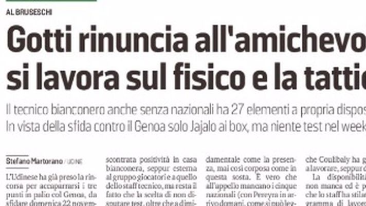 L'Udinese ha scelto di non organizzare alcuna amichevole nel fine settimana coincidente con la sosta campionato. La scelta, oltre che a diminuire potenziali rischi, permette a Gotti di strutturare un lavoro fisico particolarmente intenso e ben distribuito nell'arco delle due settimane, in abbinata, ovviamente, a quello tattico. Era tempo che al Bruseschi non presenziavano 27 bianconeri nell'arco di una sosta, di cui 23 giocatori di movimento, più i quattro portieri. La disponibilità quindi non manca ed è per questo che lo staff ha stilato un programma di lavoro atletico che da una parte presuppone un richiamo alle fasi della preparazione estiva, con precise esercitazioni metaboliche atte a sviluppare la resistenza alla velocità e dall'altra la cura della rapidità. Non mancano dunque i circuiti sul lungo e le ripetute sui 300, 200 e 100 metri. In abbinata c'è poi il lavoro tattico incentrato sui moduli, con Gotti imperterrito ad alternare il 3-5-2 alle prove sulla difesa "a 4".
