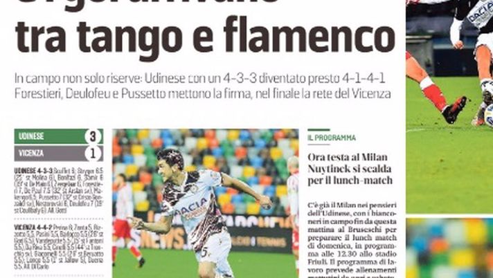 "Il risultato che ti aspetti (passaggio del turno per affrontare la Fiorentina il 25 novembre al Friuli) e un Gotti che ti sorprende. Perché l'Udinese in Coppa Italia contro il Vicenza (terzo turno eliminatorio) non era proprio così farcita di seconde linee come ci si attendeva e soprattutto ha messo in pratica fin dal primo minuto quella difesa "a 4" che è senza dubbio propedeutica per una svolta tattica rispetto al cavallo di battaglia, il 3-5-2. Gotti sta provando quel 4-1-4-1 che ha messo in campo nella ripresa di Firenze e che per larghi tratti anche con il Vicenza ha caratterizzato il gioco bianconero. Quindi linea a quattro davanti a Scuffet composta dal rientrante Stryger Larsen (buoni segnali in più un'ora di gioco), Bonifazi, Samir e Zeegelaar, con De Paul perno centrale del centrocampo (Arslan gli darà il cambio solo dopo la mezz'ora della ripresa), affiancato da Forestieri e Makengo, mentre davanti hanno giostrato Pussetto e Deulofeu con Nestorovski centravanti (Lasagna in panchina, Okaka neppure convocato). Nei primi venti minuti della ripresa l'Udinese ha letteralmente sfondato proprio con i due esterni, d'attacco. Prima Deulofeu ha accelerato per mettersi sul destro il pallone e infilarlo sotto il portiere. Poi Pussetto ha sfruttato un cambio campo per arrivare a tu per tu con Perina e superarlo con un tocco morbido. Ispiratore delle giocate il solito De Paul, letteralmente illuminante".