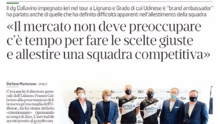"C'era anche il direttore generale dell'Udinese Franco Collavino alla presentazione della nuova prima maglia dell'Udinese, da lui stessa definita «emozionante» ripensando ai tempi di Zico. Dell'Udinese che verrà Collavino non si è detto preoccupato: «Il calciomercato ufficialmente comincerà il primo settembre e quello che stiamo vivendo oggi è quello che negli anni passati si sarebbe visto verso la fine giugno. In questo momento c'è dunque un'attività preliminare, visto che la fine del mercato sarà il 5 ottobre, con un mese davanti rispetto all'inizio effettivo del campionato e le tempistiche sono tali da consentirci di lavorare e di poter fare le scelte giuste per allestire una squadra competitiva in un campionato che è sempre più competitivo».