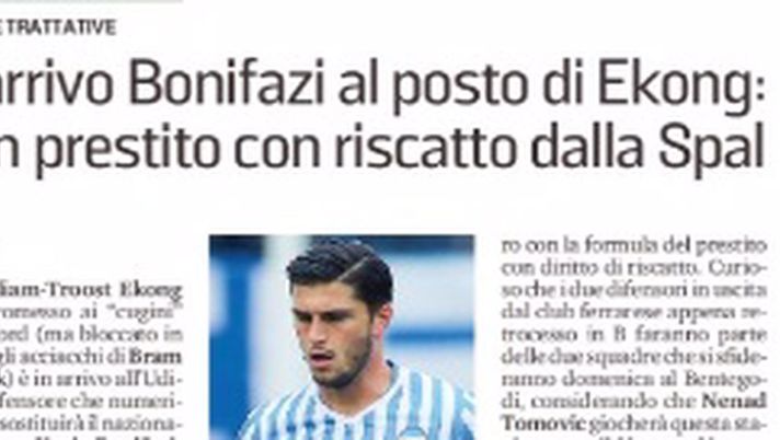 "Con William-Troost Ekong ormai promesso ai "cugini" del Watford (ma bloccato in Friuli dagli acciacchi di Bram Nuytinck) è in arrivo all'Udinese il difensore che numericamente sostituirà il nazionale nigeriano: Kevin Bonifazi, classe 1996 della Spal. È lui il centrale, tra l'altro esperto della difesa a tre, che sta per firmare con il club bianconero con la formula del prestito con diritto di riscatto. Curioso che i due difensori in uscita dal club ferrarese appena retrocesso in B faranno parte delle due squadre che si sfideranno domenica al Bentegodi, considerando che Nenad Tomovic giocherà questa stagione per il Verona".