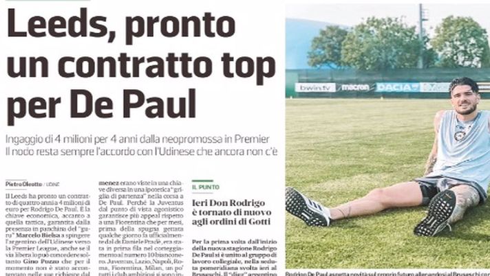 "Il Leeds ha pronto un contratto di quattro anni a 4 milioni di euro per Rodrigo De Paul, anche se il via libera lo può concedere soltanto Gino Pozzo che per il momento non è stato accontentato nelle sue richieste dal presidente del club inglese, neopromosso nella massima serie, Andrea Radrizzani. Chiede 40 milioni, l'Udinese, mentre il Leeds si è fermato molto prima, stando alle ultime indiscrezioni di mercato. Il Leeds si sarebbe fermato a 25 più bonus, contro i 35 dello Zenit. E a 25 Pozzo non intende cederlo, anche se Don Rodrigo, in virtù dei 4 milioni di ingaggio messi sul piatto, avrebbe in cuor suo già detto di sì agli inglesi. Da qui il famoso tweet postato l'altra sera e, dopo una valanga di condivisioni, cancellato. Non c'è più quel «Yes» accompagnato da due dita incrociate postato su Twitter e ormai cancellato dopo l'onda social. De Paul è tornato ad aspettare nell'ombra, magari ascoltando le proposte della Roma dei Friedkin, intenti a trovare un jolly dopo l'infortunio di Nicolò Zaniolo e ai quali Pozzo i giorni precedenti aveva offerto Roberto Pereyra dai "possedimenti" di Watford".