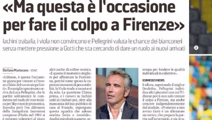 "«Udinese, è questa l'occasione giusta per vincere a Firenze e fidati del tuo stratega Gotti». Il consiglio spassionato arriva da Luca Pellegrini, che le partite solitamente le commenta nel ruolo di voce tecnica per Sky e non le pronostica. «È questo il momento migliore per affrontare la Fiorentina, perché come spesso le capita nei momenti di poca stabilità, la Viola tende a incartarsi da sola». Pellegrini invita però piazza e società a pazientare. «Io dico calma per il cambio modulo, perché la qualità deve dare sostanza senza perdere gli equilibri».