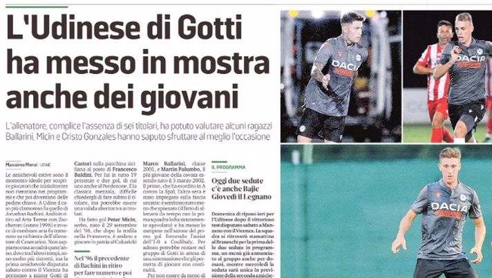 "La prima amichevole disputata sabato contro il Vicenza ha permesso a mister Gotti di scoprire che in questa rosa ci sono al momento ragazzi con un possibile futuro da professionisti. Il giocatore che ha avuto l'impatto migliore è sicuramente Mamadou Coulibaly, classe '99. È la classica mezzala, potrebbe essere una valida alternativa ai titolari. Ha fatto gol Petar Micin, per lui non ci sarà spazio a Udine. Stesso discorso per Cristo Gonzales, che peraltro sembra essere più vicino al trasferimento all'Espanyol, squadra della Segunda Division spagnola E poi ci sono i due "virgulti" dell'Udinese primavera, Marco Ballarini, classe 2001, e Martin Palumbo, nato il 5 marzo 2002. Il primo l'altra sera è stato impiegato sulla fascia sinistra e ha messo lo zampino nell'azione del primo gol fornendo l'assist dell'1-0 a Coulibaly. Anche Palumbo ha fornito un assist, quello per la rete decisiva di Nestorovski. Gino Pozzo sta pensando di portarselo al Watford".