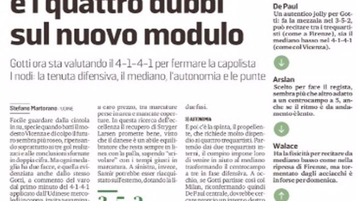 "Nel 4-1-4-1 la difesa deve restare bloccata, specie con i terzini, per compensare la propensione della squadra al pressing alto portato dai quattro trequartisti. Là dietro è dunque fondamentale evitare disattenzioni fatali, quelle che l'Udinese ha fin qui pagato a caro prezzo. In questa ricerca dell'eccellenza il recupero di Stryger Larsen promette bene. A sinistra, invece, Samir potrebbe esser riacquistato sull'esterno, dotando la linea a quattro della sua velocità. Il centrocampista ideale davanti alla difesa debba abbinare qualità e quantità, un interditore dotato di visione di gioco. È l'identikit perfetto dell'attuale Rodrigo De Paul. E poi c'è la spinta. Partendo dai due trequartisti interni, il compito impone loro di venire in aiuto al mediano trasformando il centrocampo a tre in fase difensiva, con un interno destro che potrebbe essere Pereyra, con Makengo a sinistra, oppure Forestieri con Pereyra a sinistra. Spinta e copertura vengono richiesti anche ai due trequartisti esterni. Pussetto e Deulofeu in questo momento hanno minutaggi diversi e questo potrebbe essere un vero problema per Gotti. Con questo modulo è indispensabile avere una prima punta che faccia salire la squadra difendendo anche il pallone per permettere gli inserimenti, tenendo quindi alto il baricentro del gioco. Ecco perché Okaka potrebbe fare al caso molto più di Lasagna".