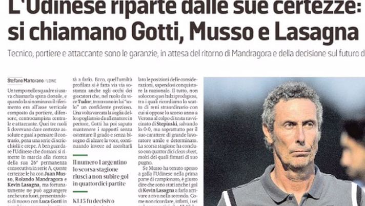 "L'Udinese che domani si rimette in marcia le certezze le ha con Juan Musso, Rolando Mandragora e Kevin Lasagna, ma fortunatamente ne può aggiungere anche una fuori, presentandosi di nuovo con Luca Gotti in panchina. Il tecnico di Contarina subentrato in punta di piedi, ha saputo mantenere i rapporti senza ostentare il grado e senza bisogno di alzare la voce, continuando invece ad ascoltarli tutti, ma dovendo decidere da responsabile. E dopo avere rispolverato e messo a lucido Nuytinck, trovato la posizione a De Paul e dato un gioco collettivo che da tempo non si vedeva, ha trovato ancora la fiducia della società. Gotti è la certezza in panchina da cui dunque riparte l'Udinese, così come lo è Juan Musso tra i pali, soprattutto per il suo carattere di grande lavoratore umile e determinato. La scorsa stagione ha concluso con quattordici clean sheet, molti dei quali firmati di suo pugno. Se Musso ha tenuto spesso a galla l'Udinese nella prima parte di campionato, è giusto dire che sono stati anche i gol di Kevin Lasagna a farla arrivare a riva nella seconda. Ecco, è proprio quella la versione dell'attaccante di cui l'Udinese avrà bisogno da domani in poi".
