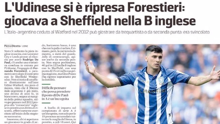 "Non c'è soltanto la pista inglese in uscita, c'è anche una trattativa conclusa in entrata per l'Udinese, l'ingaggio di Fernando Forestieri, a parametro zero dopo il contratto con lo Sheffield Wednesday. Forestieri era un talento all'inizio della propria carriera. Lo chiamavano El Topa, baricentro basso, è uno che con la palla ci sa fare. È rimasto, però, la carriera lo dimostra, a metà del guado. Jolly di centrocampo, agisce anche da seconda punta. Non segna pochissimo, 40 gol in 123 nella B inglese con lo Sheffield, con una punta di 15 reti nella sua prima stagione, ma Gino Pozzo l'ha ripreso soprattutto per la duttilità. Forestieri al "primo piano" è un'incognita. Anche per i tifosi del Watford che, saputo dei suoi allenamenti con gli Hornets avevano commentato in modo critico il possibile ritorno, come testimonia l'approfondimento del portale sul calcio Footballleagueworld.co.uk: «Disperazione, molti fan del Watford reagiscono così a un possibile ritorno». Una mossa che Gino Pozzo non ha voluto compiere a Londra, spedendo il giocatore ad allenarsi, già un paio di giorni fa, in Friuli. Ieri la firma sotto un contratto di due anni, sfruttando il fatto che Forestieri ha anche il passaporto italiano".