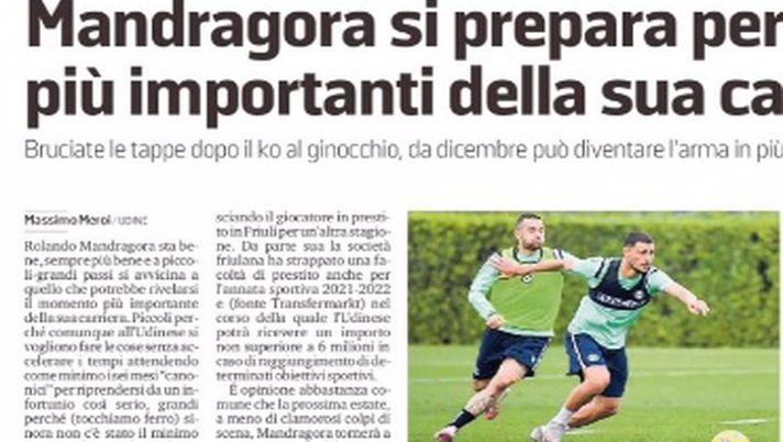 "Rolando Mandragora sta bene, sempre più bene e a piccoli-grandi passi si avvicina a quello che potrebbe rivelarsi il momento più importante della sua carriera. Il centrocampista si fece male al ginocchio destro (rottura del legamento crociato) lo scorso 23 giugno a Torino contro i granata nella prima gara dopo il lockdown di primavera; ha completato la rieducazione e da un paio di settimane lo si vede sgambettare nelle partitelle a ranghi ridotti sui campi del centro sportivo Bruseschi. Prima di dicembre difficilmente verrà convocato e solo con l'inizio del 2021 potrebbe cominciare ad avere una condizione accettabile. Se un giorno Gotti riuscirà a mettere in campo dal primo minuto tutto il talento che si ritrova in rosa lo potrà fare solo quando avrà contemporaneamente a disposizione l'acume tattico del suo numero 38 e la fisicità di Walace che in un ipotetico 4-2-3-1 diventerebbero, fatte le debite proporzioni, quello che Bennacer e Kessie sono nel Milan di Pioli. Ci sarebbe poi una seconda ipotesi ancor più ardita. Mettere De Paul a fianco di Mandragora e nel trio di trequartisti allineare Pussetto, Pereyra e Deulofeu alle spalle di uno tra Okaka e Lasagna. Oggi è fantacalcio, domani, chissà...".