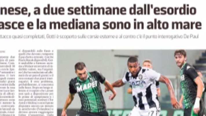 "A quindici giorni dal battesimo e ventitré dalla chiusura del mercato la costruzione del centrocampo, sia sulle corsie laterali sia nel pacchetto centrale, è in alto mare. Va fatta comunque una distinzione tra i giocatori disponibili sulle fasce e quelli che devono comporre il pacchetto centrale. Con De Paul e Barak disponibili, Gotti andrebbe a formare assieme a Walace un terzetto di indubbio valore, ma l'argentino (che ha cominciato ad allenarsi da un paio di giorni) e il ceco restano due punti interrogativi. Il vero problema, probabilmente, si concentra sulle fasce. Dopo un lungo silenzio si è saputo che Larsen non sarà a disposizione per le prime di campionato e i suoi potenziali sostituti (Ter Avest e Molina) o non hanno disputato ancora un minuto in amichevole (l'olandese) o devono ancora raggiungere Udine (l'argentino). Dalla parte opposta va leggermente meglio: anche Zeegelaar non ha ancora visto il campo mentre ha cominciato da poco la preparazione Ouwejan. Di fatto a due settimane dall'esordio Gotti non ha potuto provare nulla".