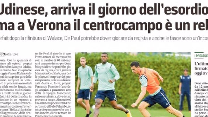 "Si parte. Oggi a Verona saranno molte le incognite a livello di intesa, gioco e produttività della squadra, in particolare in un reparto: a centrocampo. Non esattamente il massimo contro un'avversaria come l'Hellas di Juric che fa dell'aggressione, della densità in mediana, le armi migliori. Insomma, sarà in quella zona del campo che Luca Gotti si giocherà i tre punti in palio.Il forfaitL'ultima tegola dopo la seduta di rifinitura, quando Walace ha alzato bandiera bianca, vittima di un risentimento muscolare che lo mette in forte dubbio anche per tutte e due le gare casalinghe della settimana che verrà, col già citato Spezia e la Roma il prossimo sabato. Una disdetta, visto che questa assenza si aggiunge agli infortuni di Jajalo e (scontato) Mandragora e alle uscite di mercato, Fofana e Barak (passato proprio all'Hellas). Le soluzioni Rodrigo De Paul sarà un punto fermo per Gotti, bisogna dire che potrebbe giocare da regista, con il giovane Mamadou Coulibaly, una delle piacevoli sorprese del precampionato, nel ruolo di mezzala destra e, forse, proprio Fernando Forestieri (uno degli acquisti a parametro zero della campagna bianconeri) sul centrosinistra, dove è stato provato a lungo".