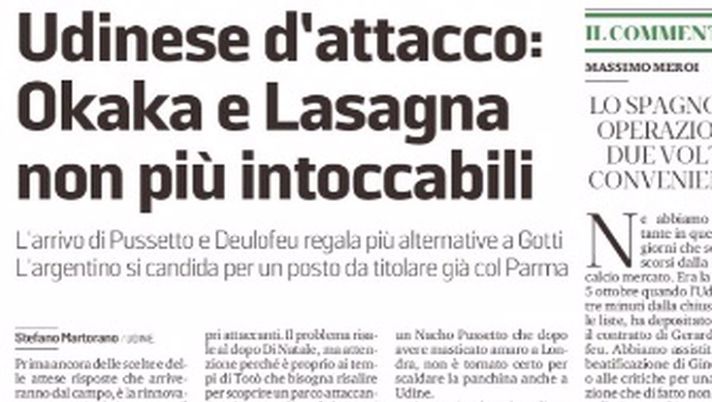 "E' la rinnovata competitività in attacco il primo benefico effetto portato dagli innesti giunti all'ultimo giorno di mercato all'Udinese. Pussetto e Deulofeu, quest'ultimo impiegabile anche come seconda punta, ridisegnano infatti le gerarchie precostituite dagli "intoccabili" Okaka e Lasagna, ampliando possibilità e scelte. Sono anni che l'Udinese stenta con i propri attaccanti. Il problema risale al dopo Di Natale, ma attenzione perché è proprio ai tempi di Totò che bisogna risalire per scoprire un parco attaccanti così vasto e di qualità. Lungi da fare paragoni scomodi per gli stessi protagonisti del gol bianconeri dei giorni nostri, ma erano dagli anni dell'Udinese di Pasquale Marino che non si contavano così tanti gol potenziali, quelli che l'Udinese può sperare di avere ora dagli attuali interpreti. I messaggi in questo caso sono indiretti, ma arrivano puntuali specialmente a Lasagna e Okaka, che senza troppi giri di parole non hanno reso da par loro nelle prime tre giornate, tra errori (l'azzurro) pesanti e prestazioni sottotono, per l'ex romanista".