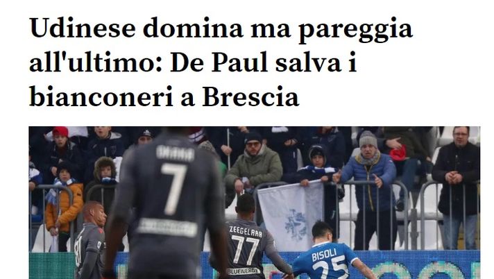 A ridosso della mezz’ora invece sono ancora i friulani a sfiorare il gol con De Maio, che sotto porta colpisce di testa esaltando i riflessi di un super Joronen, provvidenziale nel salvare i suoi. Il portiere bresciano salva ancora una volta una conclusione di De Paul che poi si stampa sulla traversa. Il Brescia a sorpresa all’81’ passa in vantaggio con Bisoli, che approfitta di un errore di lettura di De Maio e fulmina Musso per l’1-0. Nel finale i bianconeri si riversano all’attacco alla ricerca del pareggio e lo trovano a tempo scaduto con De Paul, che riesce a fulminare Joronen per il definitivo 1-1".