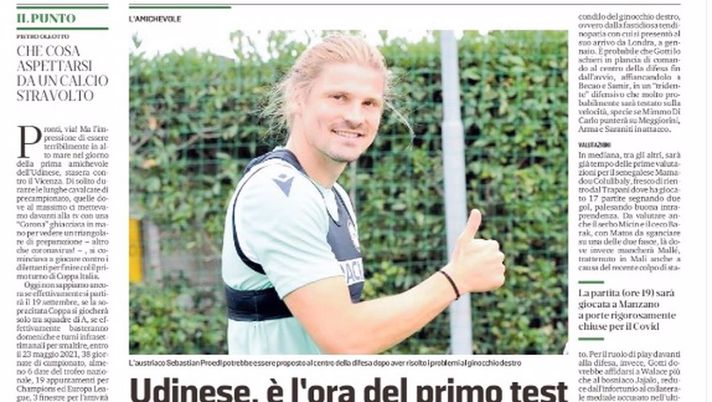 "Per la prima uscita stagionale in programma stasera a Manzano contro il Vicenza, c'è da aspettarsi un'Udinese alquanto sperimentale non tanto sul modulo, visto che il 3-5-2 resta il modulo prescelto al momento, ma sui singoli, a cominciare da Sebastian Proedl, che potrà finalmente fare il suo esordio dopo i sei mesi trascorsi a curarsi dalla fastidiosa tendinopatia con cui si presentò al suo arrivo da Londra, a gennaio. È probabile che Gotti lo schieri in plancia di comando al centro della difesa fin dall'avvio, affiancandolo a Becao e Samir, in un "tridente" difensivo che molto probabilmente sarà testato sulla velocità. Sarà già tempo delle prime valutazioni per il senegalese Mamadou Colulibaly, fresco di rientro dal Trapani. Da valutare anche il serbo Micin e il ceco Barak, con Matos da sganciare su una delle due fasce, là dove invece mancherà Mallé, trattenuto in Mali anche a causa del recente colpo di stato. Per il ruolo di play davanti alla difesa, invece, Gotti dovrebbe affidarsi a Walace più che al bosniaco Jajalo, reduce dall'infortunio al collaterale mediale accusato nell'ultima parte della scorsa stagione".