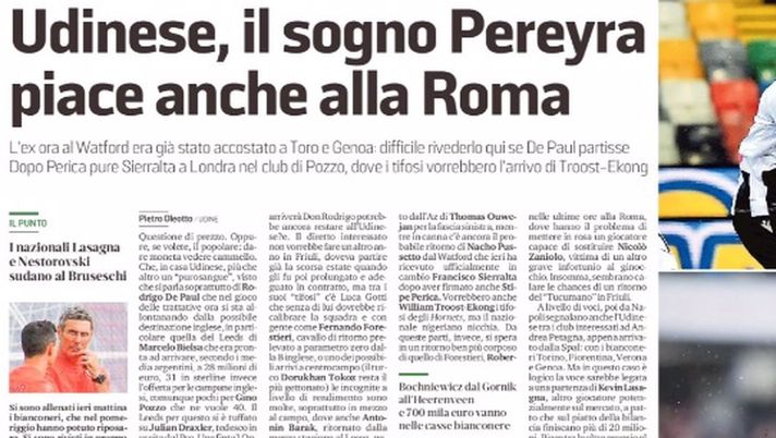 "In Italia la Fiorentina osserva con attenzione l'evoluzione, visto che De Paul è un vecchio pallino del ds Daniele Pradè, ma è soprattutto la Juventus la possibile acquirente del numero 10 argentino. Ma se la megaofferta non arriverà Don Rodrigo potrebbe ancora restare all'Udinese. Il diretto interessato non vorrebbe fare un altro anno in Friuli, doveva partire già la scorsa estate quando gli fu poi prolungato e adeguato in contratto, ma tra i suoi "tifosi" c'è Luca Gotti che senza di lui dovrebbe ricalibrare la squadra e le incognite a livello di rendimento sono molte, soprattutto in mezzo al campo, dove anche Antonin Barak, ritornato dalla mezza stagione al Lecce, pare in uscita. In canna c'è ancora il probabile ritorno di Nacho Pussetto dal Watford che ieri ha ricevuto ufficialmente in cambio Francisco Sierralta dopo aver firmato anche Stipe Perica. Vorrebbero anche William Troost-Ekong i tifosi degli Hornets, ma il nazionale nigeriano nicchia. Da queste parti, invece, si spera in un ritorno ben più corposo di quello di Forestieri, Roberto Pereyra, classe 1991, nel giro dell'Albiceleste, soprattutto se De Paul partisse. Il problema è che, oltre all'ostacolo del passaporto non comunitario, ci sono gli orientamenti del giocatore e del Watford".
