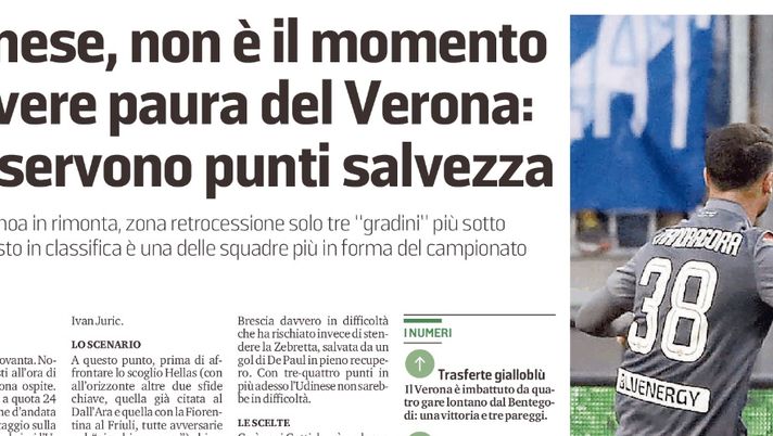 "L'Udinese si ritrova con in tasca uno striminzito +3 sul terzultimo posto, occupato dal Genoa. La situazione è complicata in casa Udinese, tanto più che ospitare il Verona di questi tempi (pareggi con Milan e Lazio, vittoria sulla Juventus nel giro di una settimana) non è una cosa semplice, come testimonia un meritatissimo sesto posto in classifica che premia il calcio coraggioso e garibaldino di Ivan Juric. Il punto perso al 93' con il Milan (tacendo le numerose palle-gol che avrebbero potuto portare anche al bottino pieno a San Siro), lo sciagurato primo tempo di Parma (e l'ennesima caterva di sprechi nella ripresa), l'incapacità di matare il Brescia al Rigamonti, un Brescia davvero in difficoltà che ha rischiato invece di stendere la Zebretta, salvata da un gol di De Paul in pieno recupero. Le scelte Così oggi Gotti dovrà andare a caccia della vittoria a tutti i costi per non finire nei guai".