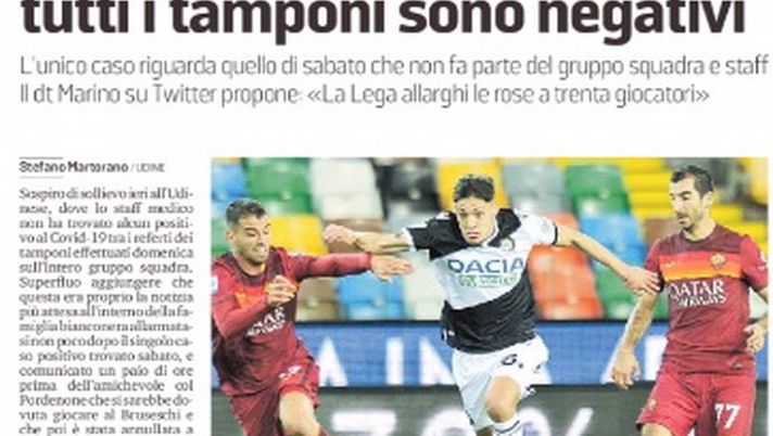 "Sospiro di sollievo ieri all'Udinese, dove lo staff medico non ha trovato alcun positivo al Covid-19 tra i referti dei tamponi effettuati domenica sull'intero gruppo squadra. A ieri, dunque, l'unico caso positivo riscontrato all'Udinese resta ancora quello accertato sabato e che non appartiene né al gruppo dei giocatori e né a quello dello staff tecnico, come la società stessa aveva evidenziato con un comunicato ufficiale. Il nome del positivo, né l'ambito di competenza è stato reso pubblico, la vita dei prossimi giorni tra gli addetti ai lavori sarà limitata e circoscritta alla sfera familiare e lavorativa, con spostamenti relativi alla sola tratta casa-lavoro e ritorno. A oggi resta anche da decidere se l'Udinese sosterrà il classico ritiro prepartita del sabato, visto che domenica i bianconeri ospiteranno il Parma al Friuli. Inoltre, la prassi impone ancora una serie di tamponi a tappeto per i prossimi giorni, Gotti ovviamente incrocia già le dita".