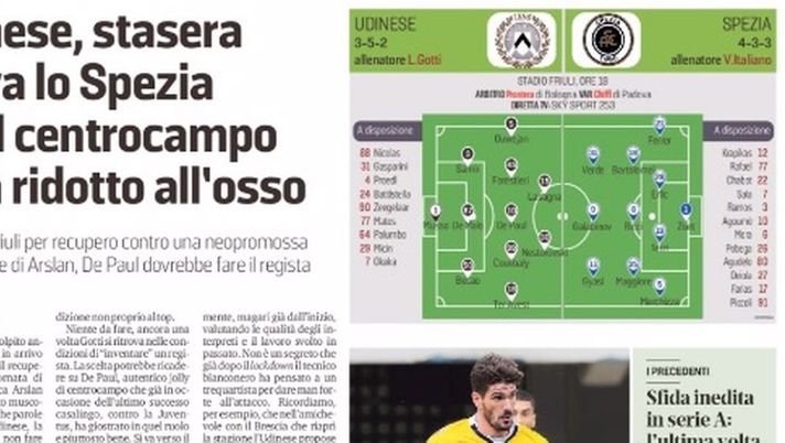 "«Manca Arslan per un affaticamento muscolare». Queste le uniche parole arrivate ieri dall'Udinese, la società ha deciso di non fare parlare Luca Gotti a differenza di quanto è successo sul fronte opposto al collega Vincenzo Italiano, particolarmente preoccupato dalla fisicità bianconera (ma questo è un refrain degli avversari, ormai). Quanto prima ci fu il forfait di Mandragora, poi quello di Jajalo, quindi quello di Walace, di nuovo fuori gioco per un problema muscolare. E ieri dalla lista dei convocati è uscito pure il turco-tedesco, appena ingaggiato a parametro zero dal Fenerbahçe. Ancora una volta Gotti si ritrova nelle condizioni di "inventare" un regista. La scelta potrebbe ricadere su De Paul, autentico jolly di centrocampo che già in occasione dell'ultimo successo casalingo, contro la Juventus, ha giostrato in quel ruolo e piuttosto bene. Un 3-4-1-2 che si potrebbe rivedere anche stasera contro lo Spezia.Forestieri sembra adatto al ruolo tra le linee, così come potrebbe essere in futuro con Roberto Pereyra, non convocato per questa gara da Gotti al pari di Nuytinck, ancora acciaccato, seppur in fase di recupero. Insomma, la gara di stasera con una neopromossa è importante sia sotto il profilo del risultato, sia in chiave tattica, valutando gli innesti messi a disposizione dalla società".