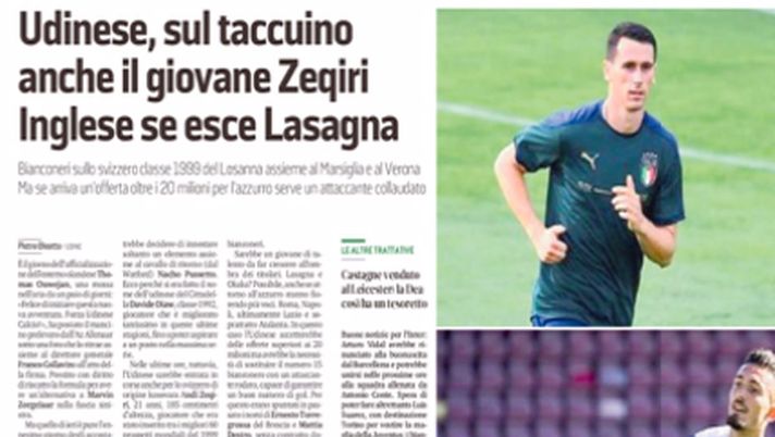 "Nelle ultime ore l'Udinese sarebbe entrata in corsa anche per lo svizzero di origine kosovara Andi Zeqiri, 21 anni, 185 centimetri d'altezza, giocatore che era stato inserito tra i migliori 60 prospetti mondiali del 1999 (la tradizionale classifica degli inglesi di "The Guardian"). E' stato cercato nelle ultime settimane soprattutto dai francesi dell'Olympique Marsiglia, ma anche da quelli del Nizza e del Lens, in Italia, invece, piace al Verona, oltre che ai bianconeri. Lasagna e Okaka? Possibile, anche se attorno all'azzurro stanno fiorendo più voci. Roma, Napoli, ultimamente Lazio e soprattutto Atalanta. Per questo erano spuntati in passato i nomi di Ernesto Torregrossa del Brescia e Mattia Destro, senza contratto dopo quello chiuso con il Bologna (e gli ultimi otto mesi in prestito al Genoa).Accanto a questi si potrebbe sistemare adesso anche Roberto Inglese del Parma, reduce da un grave infortunio (operazione in Finlandia ai tendini dei muscoli flessori della parte posteriore della coscia), ma clinicamente guarito. L'Udinese potrebbe usare Antonin Barak, richiesto dal neo tecnico ducale Fabio Liverani, per imbastire un affare nel caso servisse arrivare al sostituto di Lasagna".