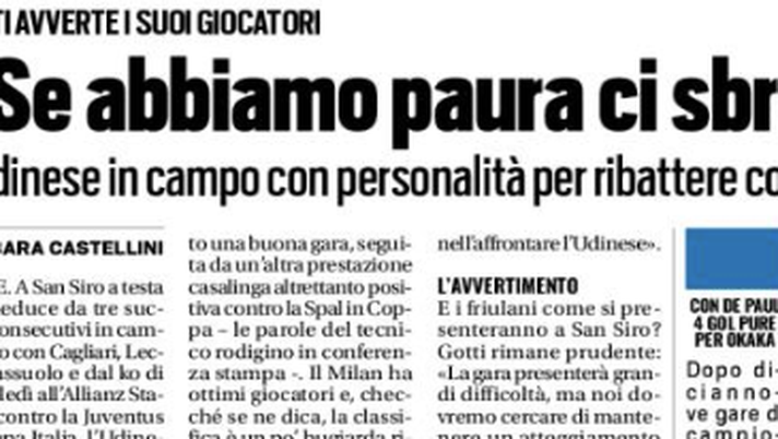 Tuttosport: Gotti avverte l’Udinese, “se col Milan abbiamo paura ci sbranano”