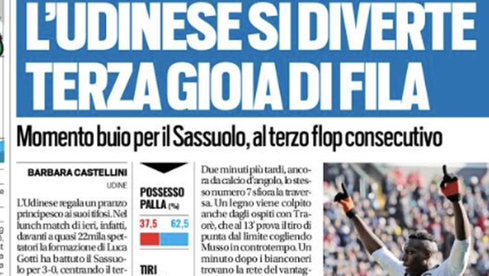 L'analisi di Tuttosport alla vittoria dell'Udinese sul Sassuolo: