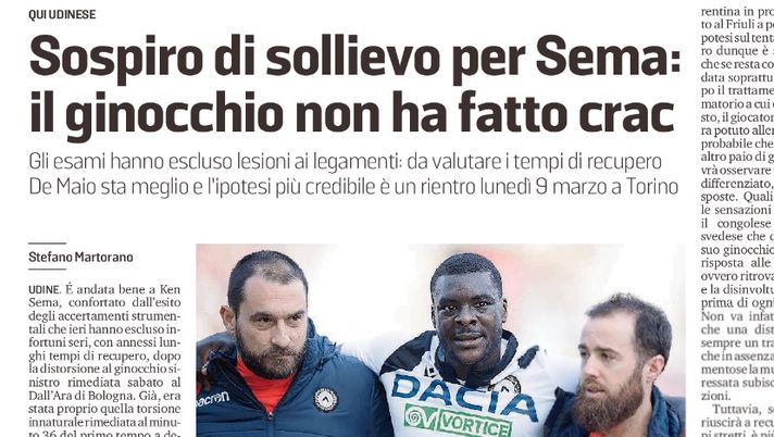 "Sospiro di sollievo per Sema: il ginocchio non ha fatto crac" titola il Messaggero Veneto: