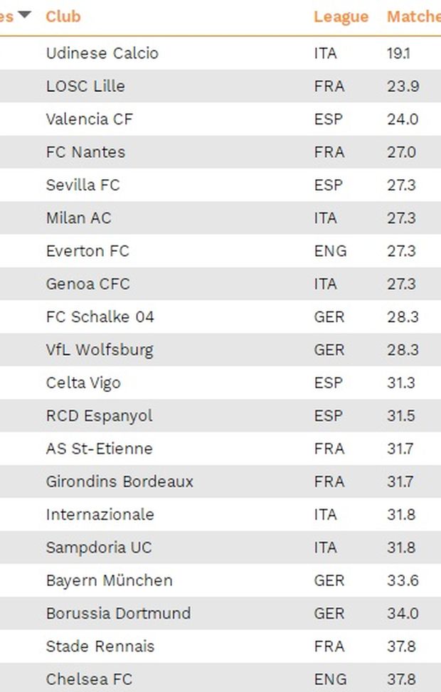 Considerando invece il numero di allenatori avvicendatisi nei club appartenenti sempre ai Top-five, sorprende (ma non troppo) trovare in prima posizione l'Udinese con 10 allenatori che hanno gestito in media 19,1 partite, meno di tutti i colleghi degli altri maggiori campionati europei.