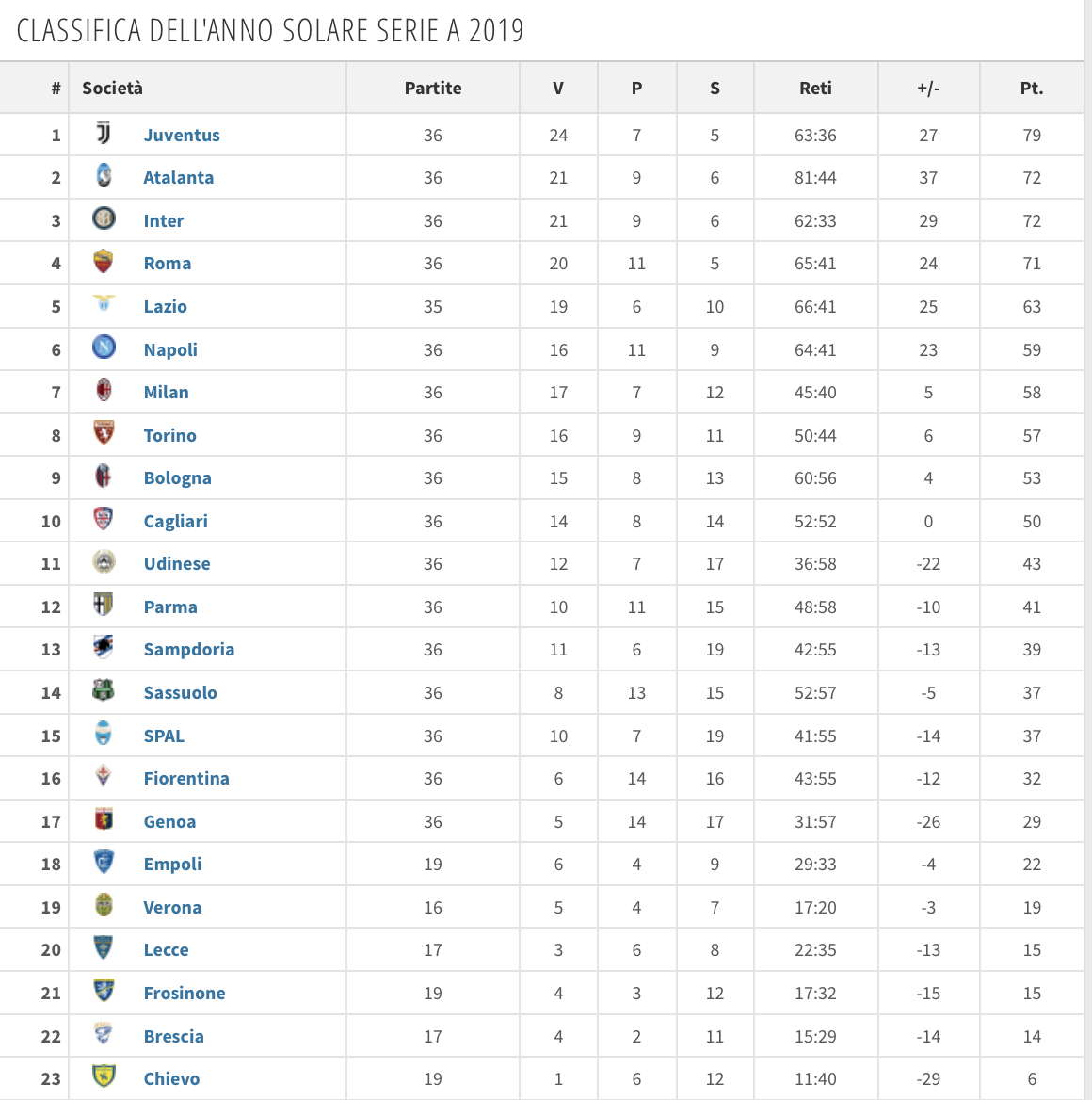 La maglia nera del 2019 va a Genoa, Fiorentina e Spal che chiudono l'anno solare rispettivamente con 29, 32 e 37 punti, escludendo ovviamente le squadre neopromosse e retrocesse la scorsa estate. Per l'Udinese di Tudor prima e Gotti poi un undicesimo posto con 43 punti, a sei lunghezze dalla terzultima. Per i bianconeri 12 vittorie, 7 pareggia ben 17 sconfitte. Per quanto riguarda i gol sono 26 quelli segnati e ben 58 quelli presi.