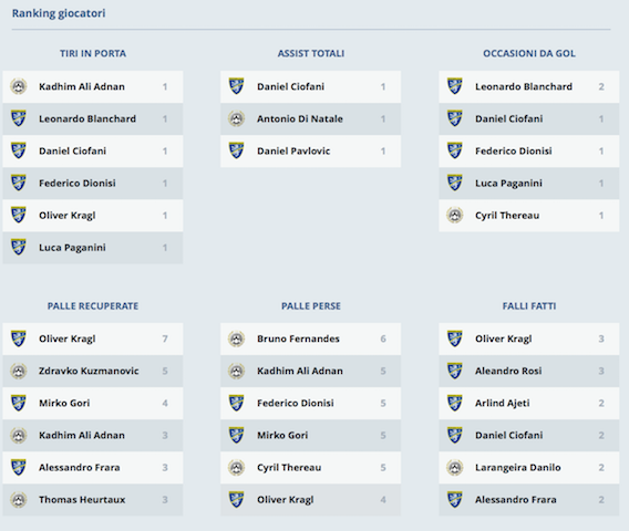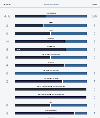 I numeri ufficiali di Frosinone-Udinese con i bianconeri completamente sotto su tutte le cifre