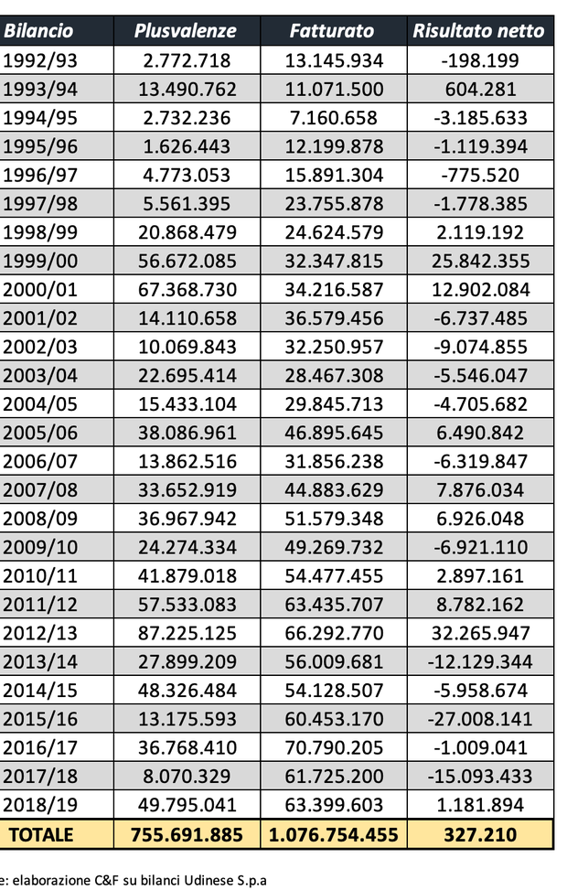 Udinese, dal 1992/93 750 milioni in plusvalenze