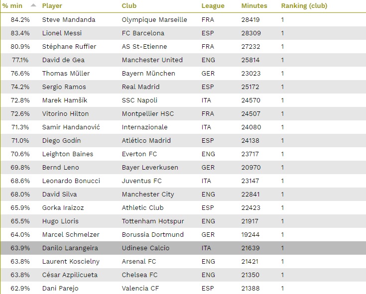 Al primo posto Steve Mandanda dell'Olimpique Marsiglia schierato per l'84,2% dei minuti complessivi giocati dal club in Ligue 1, segue Messi con l'83,4% mentre l'ex bianconero occupa il 18° con il 63,9% dei minuti di gioco dell'Udinese
