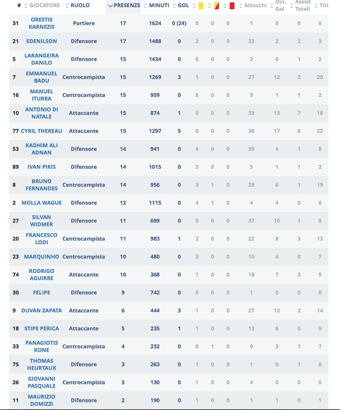 A seguire i numeri analizzati dalla Legaseriea dopo 17 giornate relativi all'Udinese.