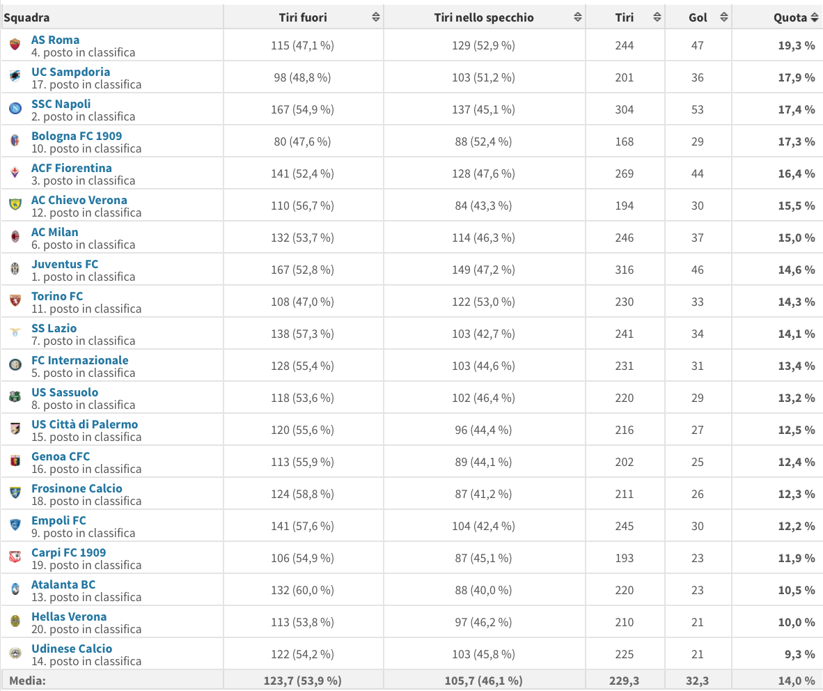 L'Udinese ha la percentuale di realizzazione più bassa della serie A. Solo il 9,3% dei tiri viene concretizzato, nessuno fa peggio