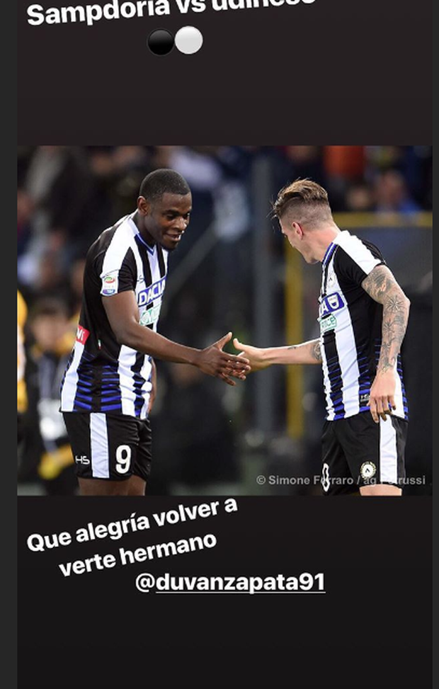 Fabio Quagliarella e Duvan Zapata in blucerchiato, Maxi Lopez in bianconero: Sampdoria-Udinese (calcio di inizio alle 15 allo stadio Luigi Ferraris) è anche un interessante incrocio tra ex. E amici. Come Rodrigo De Paul e Duvan Zapata che dopo aver disputato un campionato insieme con la maglia bianconera (2016-2017) hanno mantenuto un legame di amicizia. E proprio pochi istanti fa il fantasista argentino ha dedicato una story su Instagram all'attaccante colombiano, che oggi ritroverà da avversario: "Che bello rivederti fratello".