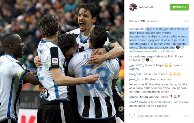 Vittoria e finalmente bianconeri rilassati e che possono festeggiare dopo settimane davvero complicate. Felipe, come al solito, non ha voluto far mancare il saluto ai tifosi e il suo commento nel dopo gara attraverso Instagram: "Oggi si festeggia, davanti ad un buon rosso friulano una vittoria importantissima!Ripenso alla partita e sono felice, sono orgoglioso di essere parte di questo gruppo, di questa città e di questa gente. Grazie ragazzi, grazie tifosi"