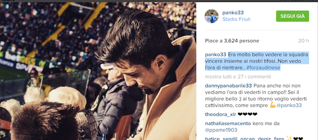 "Era molto bello vedere la squadra vincere insieme ai nostri tifosi..Non vedo l'ora di rientrare.. #forzaudinese". Cin questo post sul suo profilo Instagram Panagiotis Kone ha voluto ribadire che l'iniziativa che l'ha portato insieme alla gente ha funzionato a meraviglia. In attesa di tornare in campo, naturalmente. Il greco potrebbe aggregarsi ai compagni prima di Natale.