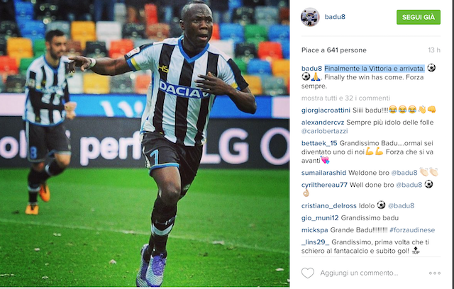 Badu, autore della prima rete, commenta: "Finalmente la Vittoria è arrivata".